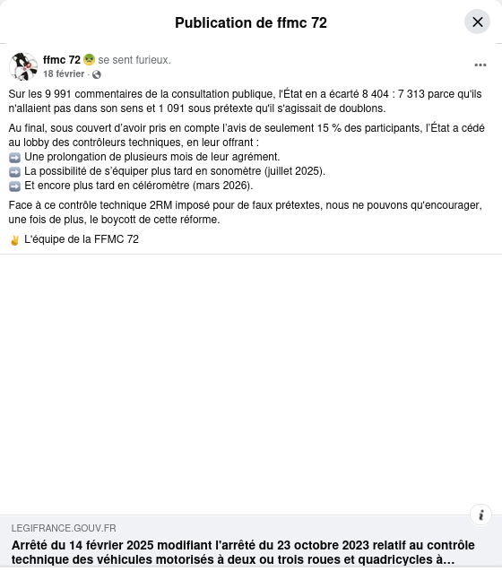 đą En rĂ©action au post publiĂ© par la FFMC72, je souhaite apporter mon soutien total et rappeler que des travaux sont en cours, avec plusieurs acteurs engagĂ©s, pour exiger la transparence totale du gouvernement sur le processus de mise en place du contrĂŽle technique moto (CT moto).