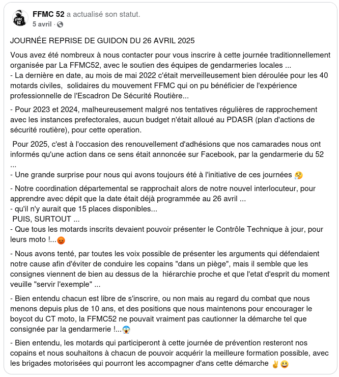 Et là , merci et bravo à la FFMC52, qui a su tenir la ligne, refuser de « faire semblant », et affirmer une position claire et courageuse.