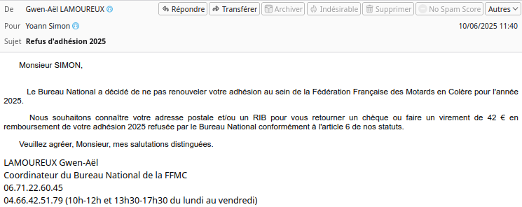 - En date du 16 juillet 2025, Vanessa Lebrun, agissant pour la FFMC TN au nom du Bureau National, adresse un courriel Ă Yoann Simon lui rĂ©clamant un RIB ou une adresse postale afin dâeffectuer le remboursement de son adhĂ©sion 2025 refusĂ©e.