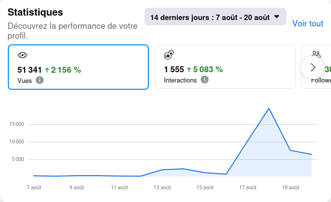 MĂȘme en Ă©tant peu actif (vacances obligent ✌), la portĂ©e reste trĂšs importante :Stat_facebook_21082025.jpeg
