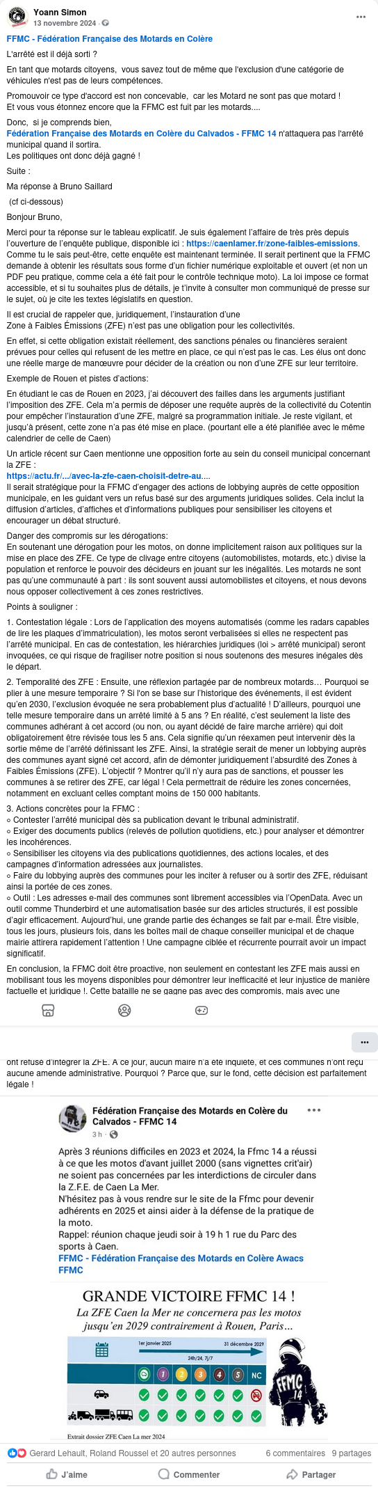 Le 2 mars 2025, jâai adressĂ© Ă toutes les antennes dĂ©partementales de la FĂ©dĂ©ration Française des Motards en ColĂšre (FFMC) un mail dâanalyse juridique concernant lâarrĂȘtĂ© ZFE de Caen la Mer.